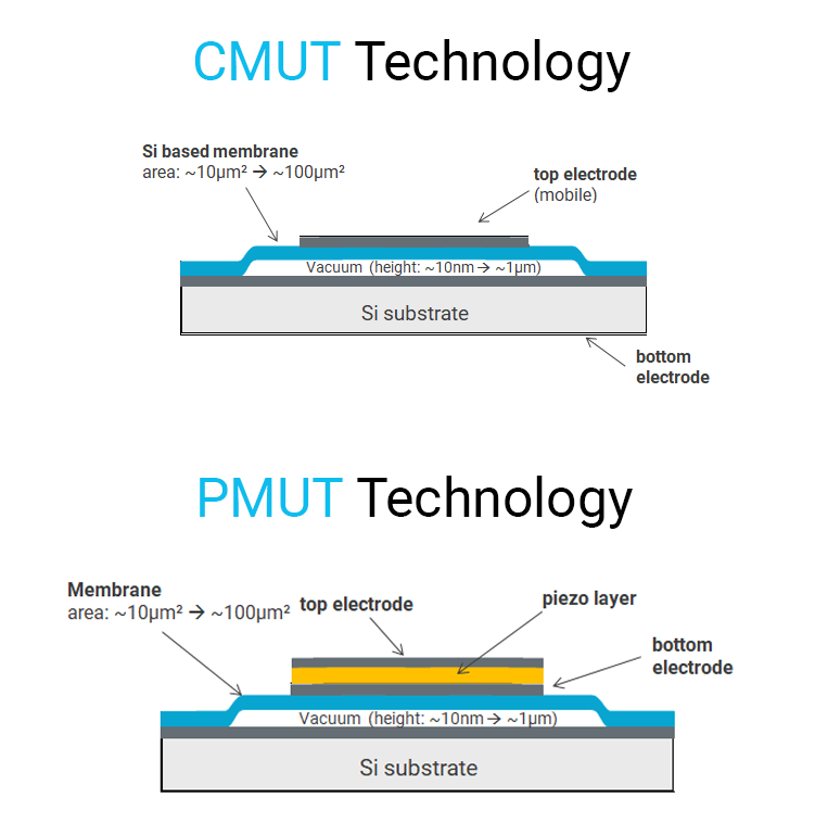 - CMUT: Features a conductive layer on the vibrating membrane, using electrostatic forces to create and detect acoustic waves, which enhances the electro-mechanical transduction efficiency and allows precise control over a wide range of operating frequencies.